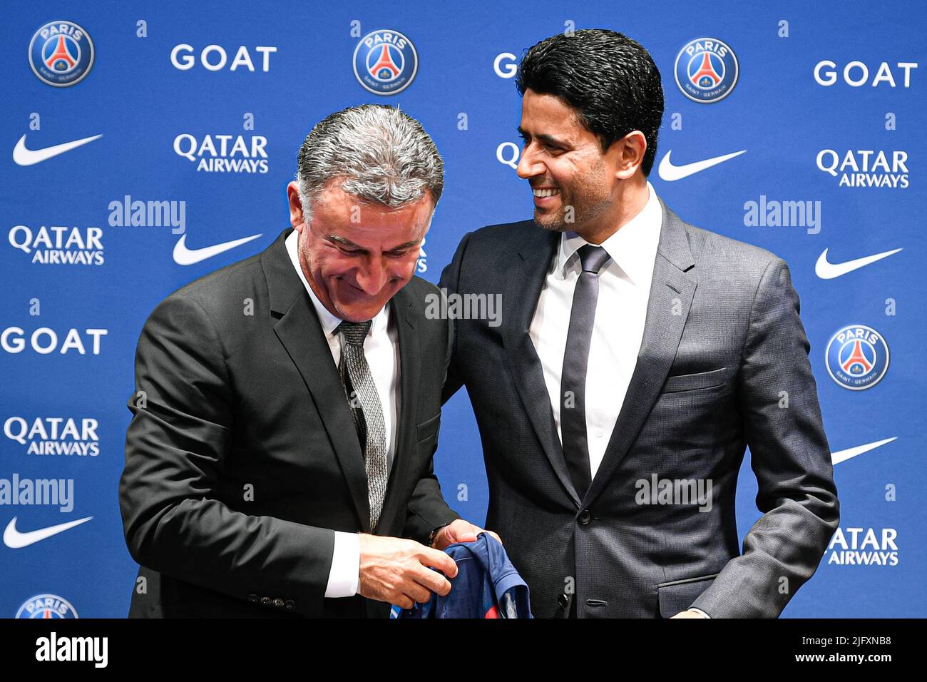 Paris France 05th July 2022 French Coach Christophe Galtier L And Psg S President Nasser Al Khelaifi R Holds A Jersey As They Pose At The End Of A Press Conference After Galtier Was